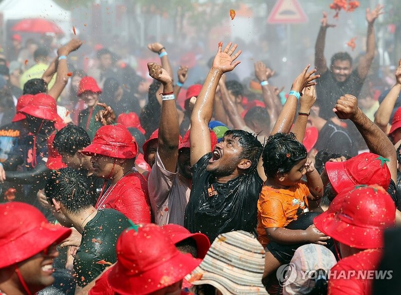 | ▲ A foreigner enjoys his time in a tomato-filled pool at the Tomato Festival in Hwacheon, Gangwon Province, on Aug. 3, 2024. (Yonhap) |