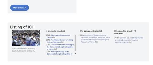 North Korea currently has four items on the ICH, including the traditional Korean wrestling ssireum, the custom of making the preserved side dish kimchi and the Arirang folk song.