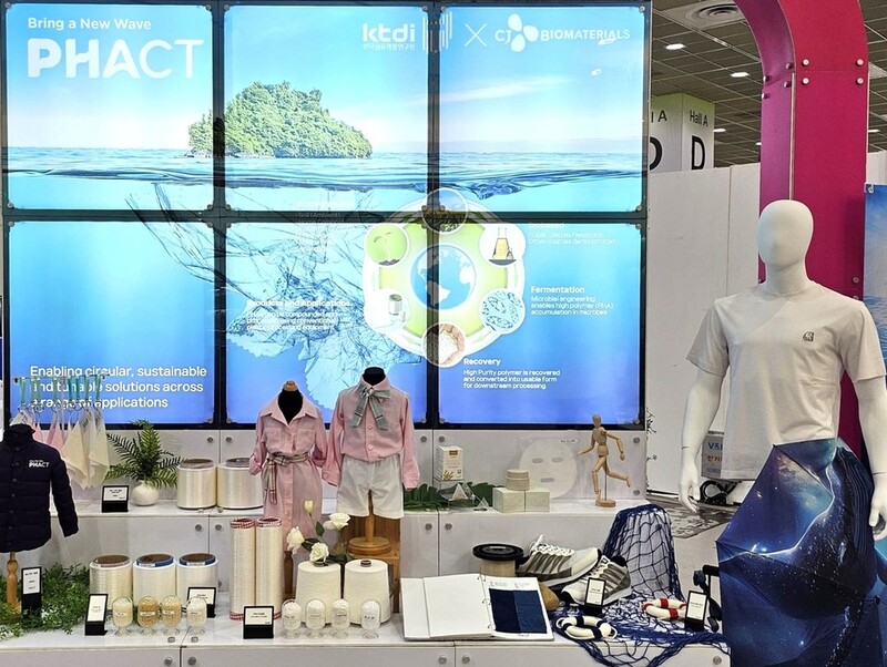 CJ제일제당은 이번 전시에서 PHA를 적용한 실과 섬유, 부직포 등을 공개했고 이를 활용해 만든 의류와 신발을 선보였다.