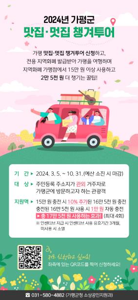 (가평=연합뉴스) 김도윤 기자 = 경기 가평군은 다음달 31일까지 '맛집·멋집 챙겨 투어 카드'를 충전해 사용하면 최대 2만5천원을 혜택받을 수 있다고 3일 밝혔다.