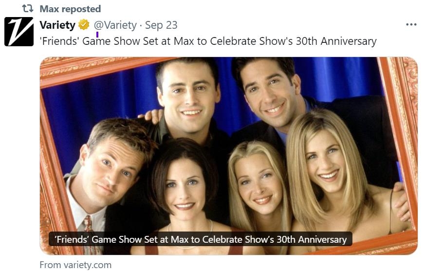 | ▲ 추억의 시트콤 '프렌즈' 첫 방영 30주년 [맥스(Max) X 게시물 캡처. 재판매 및 DB 금지] |