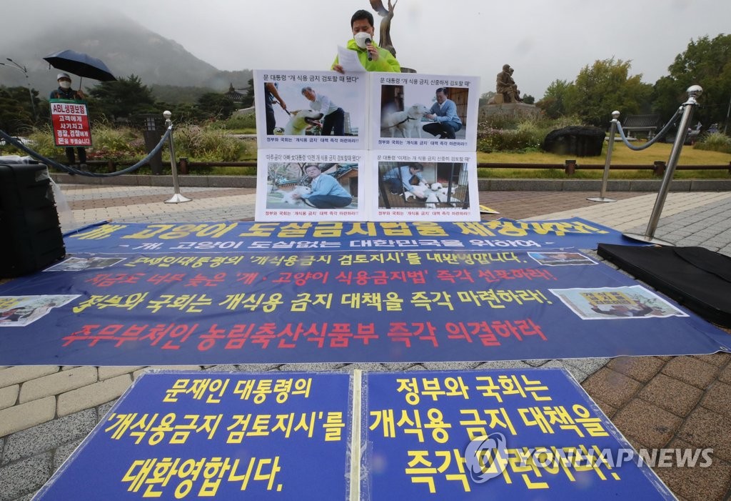 | ▲ '개 식육 금지 대책 즉각 마련하라' (서울=연합뉴스) 이재희 기자 = 6일 오후 청와대 분수대 앞에서 이원복 한국채식연합 대표가 '개·고양이 도살금지법' 제정을 촉구하는 기자회견을 하고 있다. 2021.10.6 scape@yna.co.kr |