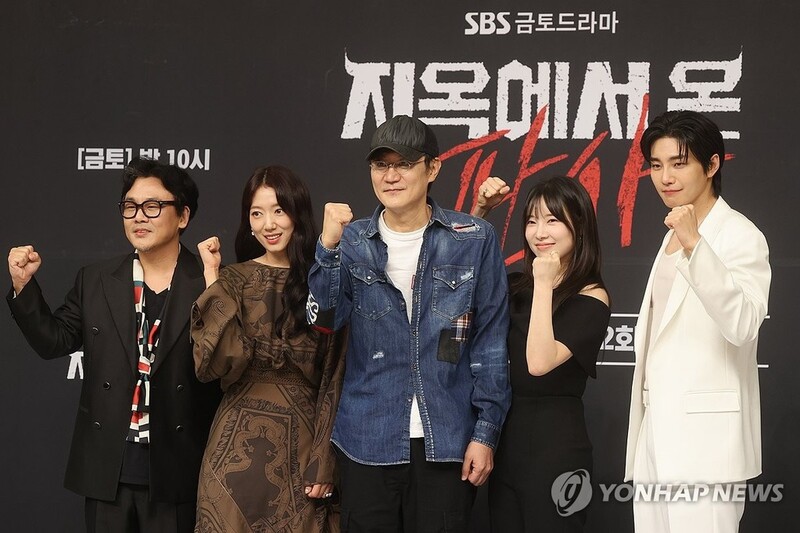 | ▲ 드라마 '지옥에서 온 판사' 제작발표회 (서울=연합뉴스) 류효림 기자 = 배우 김인권(왼쪽부터), 박신혜, 박진표 감독, 김아영, 김재영이 19일 오후 서울 양천구 목동 SBS사옥에서 열린 SBS 새 금토드라마 '지옥에서 온 판사' 제작발표회에서 포즈를 취하고 있다. 2024.9.19 ryousanta@yna.co.kr |