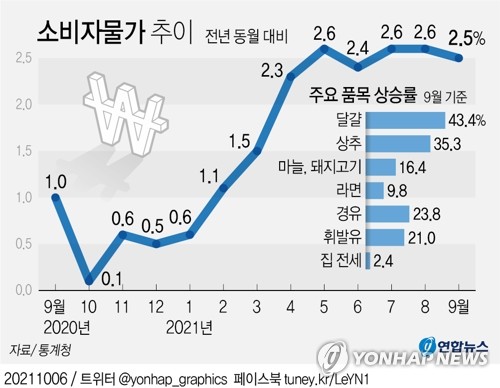 | ▲ [그래픽] 소비자물가 추이 (서울=연합뉴스) 김영은 기자 = 통계청에 따르면 9월 소비자물가지수는 108.83(2015년=100)으로 지난해 같은 달보다 2.5% 상승했다. 0eun@yna.co.kr 트위터 @yonhap_graphics 페이스북 tuney.kr/LeYN1 |