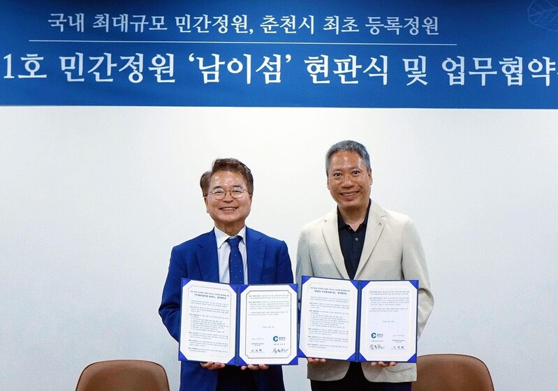 춘천시와 남이섬은 21일 민간정원 등록을 알리는 현판식과 업무협약식을 진행했다.