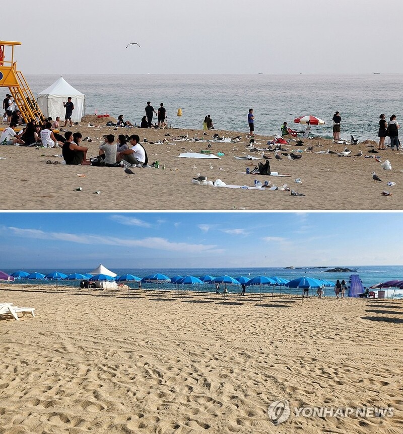 | ▲ 버려진 양심과 청소 후…원래 이렇게 깨끗한 곳 (강릉=연합뉴스) 유형재 기자 = 강원 강릉시 경포해수욕장 폐장일인 18일 밤새 피서객들이 버린 각종 쓰레기가 백사장에 널려 있는 모습(위)과 강릉시가 청소한 후의 깨끗한 모습이 대조를 보인다. 2024.8.18 yoo21@yna.co.kr |