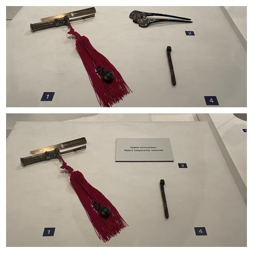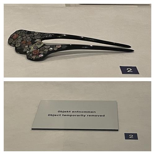 | ▲ 훔볼트 포럼 한국유물특별전서 사라진 일본 머리장식 (베를린=연합뉴스) 이율 특파원 = 훔볼트포럼 한국유물특별전서 18일(현지시간) 한국비녀로 잘못 소개됐던 일본 여성의 머리 장식인 칸자시(簪)로 추정되는 유물이 사라졌다. 2023.10.21 |