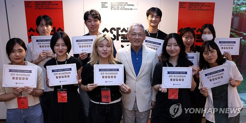 | ▲ 대한민국 미술축제 현장 방문한 유인촌 장관 (서울=연합뉴스) 유인촌 문화체육관광부 장관이 29일 서울 용산구 서계동 옛 국립극단 백성희장민호극장에서 30일부터 시작하는 '대한민국 미술축제' 첫번째 행사 2024 아시아 대학생·청년 작가 미술축제 아시아프(ASYAAF) 작품 설치 현장을 방문해 작가들에게 2024 대한민국 미술축제 광주·부산비엔날레 통합 입장권을 선물한 뒤 기념 촬영하고 있다. 2024.7.29 [문화체육관광부 제공. 재판매 및 DB 금지] photo@yna.co.kr |