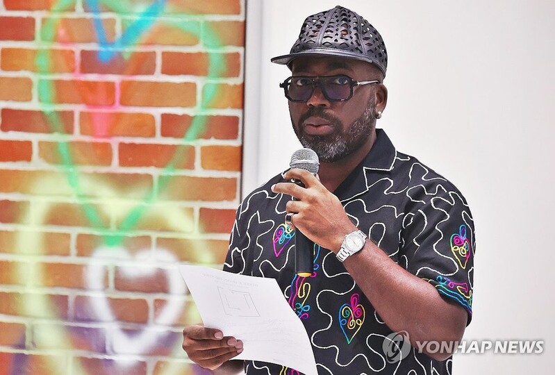 | ▲ 데릭 애덤스, 국내 첫 개인전으로 내한 (서울=연합뉴스) 진연수 기자 = 미국 작가 데릭 애덤스가 2일 오전 서울 용산구 아모레퍼시픽 본사 APMA 캐비닛에서 열린 국내 첫 개인전 '더 스트립(The Strip)' 기자간담회에서 작품을 소개하고 있다. 이번 전시는 세계 최대 화랑인 거고지언(가고시언) 갤러리의 한국 첫 전시로 데릭 애덤스의 회화 신작들을 만날 수 있다. 2024.9.2 jin90@yna.co.kr |