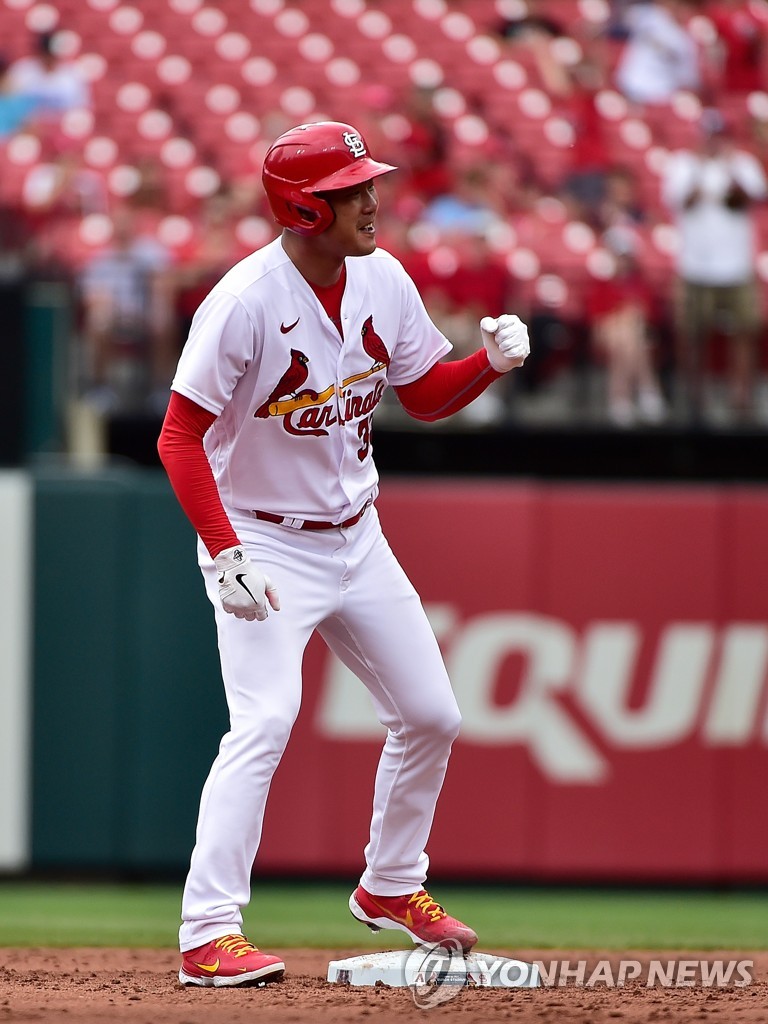 | ▲ 김광현, 결승타의 주인공 (세인트루이스 USA투데이스포츠/로이터=연합뉴스) 세인트루이스 카디널스 왼손 선발 김광현이 1일(한국시간) 미국 미주리주 세인트루이스 부시 스타디움에서 열린 미국 메이저리그 애리조나 다이아몬드백스와의 홈경기, 2회말 2사 1, 2루 타석에 들어서서 좌중간을 가르는 2타점 2루타를 친 뒤 기뻐하고 있다. |