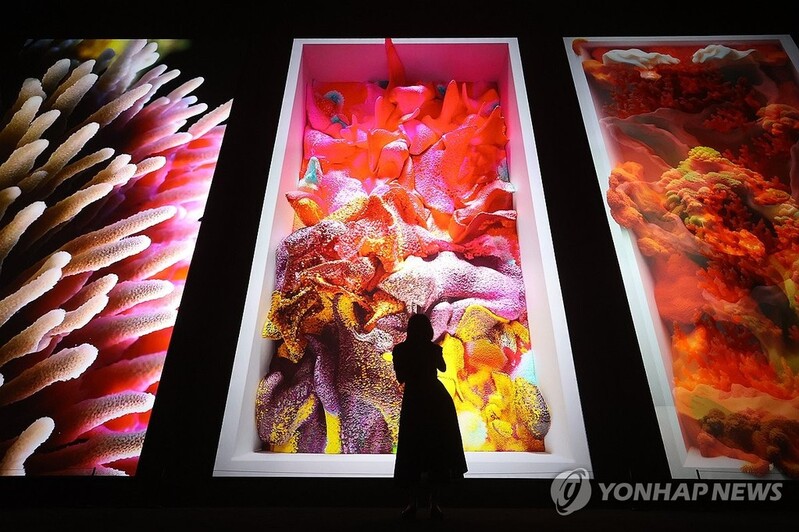 (서울=연합뉴스) 김경윤 기자 = 높이 11m의 벽면에 걸린 대형 스크린 위에 수없이 많은 색 입자가 다양한 형태를 이뤘다가 무너지기를 반복한다.