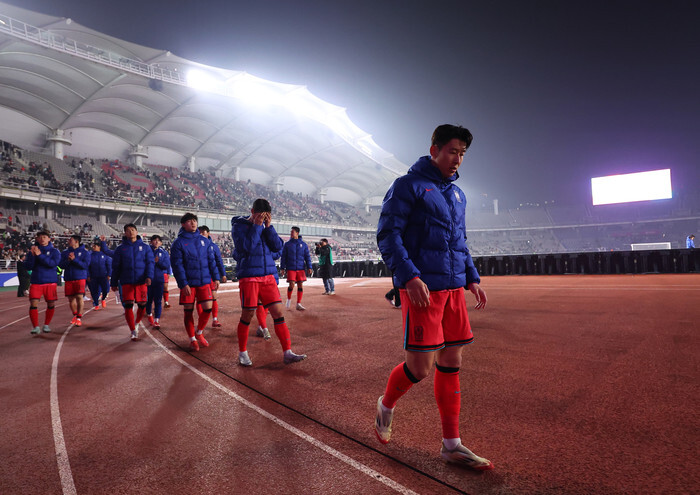 South Korean players leave the pitch at Goyang Stadium in Goyang, northwest of Seoul, on March 20, 2025, after a Group B football match against Oman in the third round of Asian qualifying for the 2026 World Cup ended in a 1-1 draw. (Yonhap)