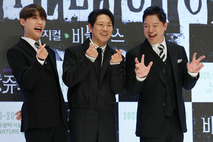 The stars of the new musical "Beetlejuice" -- (from L to R) Kim Jun-soo, Jung Won-young and Jung Sung-hwa -- pose for a photo during a publicity event in Seoul on Dec. 1, 2025. The musical will run from Dec. 16 to March 22. (Yonhap)