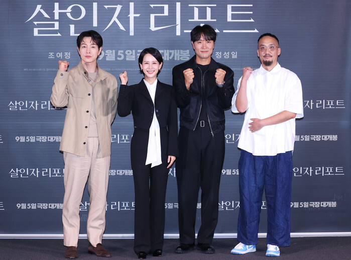 The stars of the new movie "Murder Report" -- Jung Sung-il, Jo Yeo-jung and Kim Tae-han (L to 2nd R) -- pose for a photo along with director Jo Young-jun (R) during a publicity event in Seoul on Aug. 28, 2025, to promote the movie, set to hit local screens in South Korea on Sept. 5. (Yonhap)