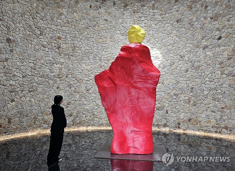 | ▲ 우고 론디노네의 노란색과 빨간색 수도승 4월 6일 원주시 뮤지엄 산(SAN)에서 현대미술가 우고 론디노네의 국내 최대 규모 개인전 '번 투 샤인'(BURN TO SHINE) 전시가 개최된 가운데 백남준관에 '노란색과 빨간색 수도승' 작품을 전시하고 있다.[연합뉴스 자료사진] |