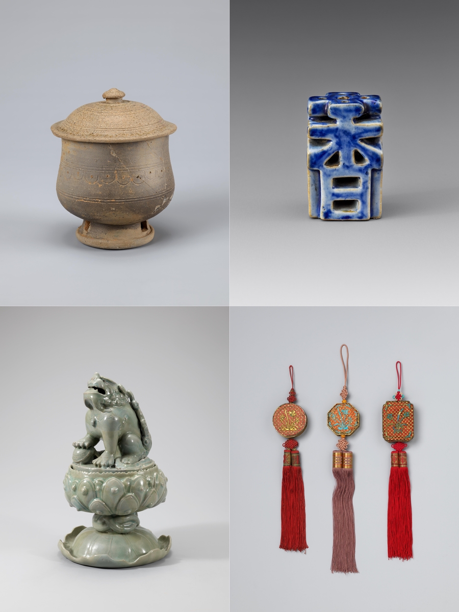 | ▲ 주요 전시품 왼쪽 위부터 시계 방향으로 국립김해박물관 소장 양산 북정리 출토 토기 향로, 국립중앙박물관 소장 백자 청채투각향자모양 향꽂이, 호림박물관 소장 향갑 노리개와 청자 사자장식 향로 [호림박물관 제공. 재판매 및 DB 금지] |