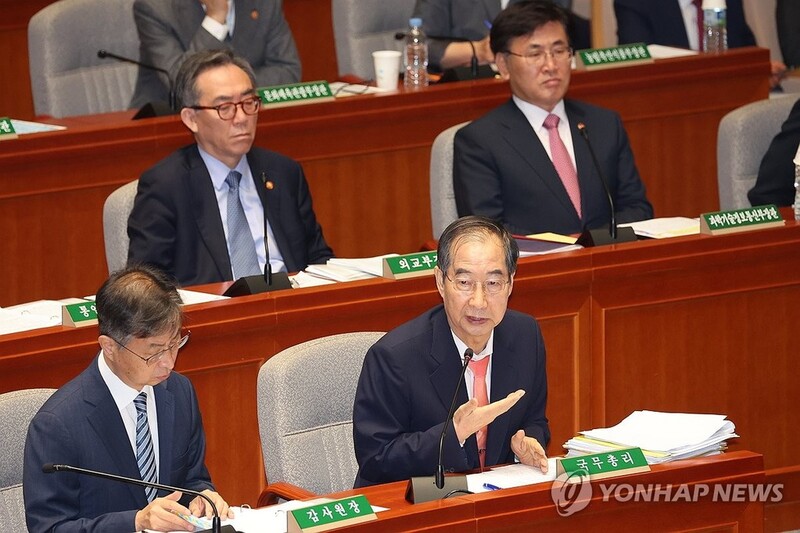 (서울=연합뉴스) 홍국기 기자 = 한덕수 국무총리는 2일 '우리나라가 키운 라인을 일본에 내줬다'는 더불어민주당 황정아 의원의 주장에 "그게 바로 가짜뉴스고 선동 아니냐"고 말했다.