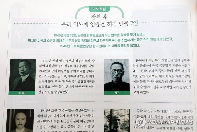 이와 별도로 이 교과서는 '광복 후 우리 역사에 영향을 끼친 인물 7인'을 실었는데 이승만 전 대통령 사진을 제일 앞에 실으면서 '광복 후 독립촉성중앙협의회를 결성하고, 신탁통치 반대와 남한 단독 임시정부 수립을 주장하였다'라고 적었다.