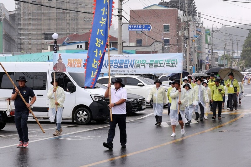 이날 오전 삼척 이사부독도기념관 광장부터 이사부 광장까지 척주취타대와 항로탐사대의 거리 행진에 이어 안전 기원제와 출정식이 진행됐다.