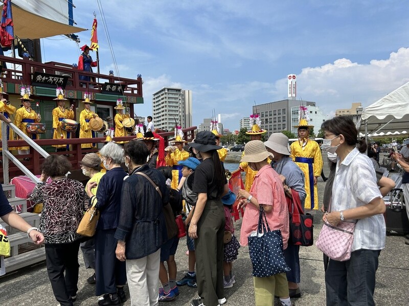 참석자들은 조선통신사선에 대한 설명을 주의 깊게 듣고 전통 공연을 즐겼다. '아리랑', '돌아와요 부산항에' 등을 연주하자 현지 주민들은 손뼉을 치며 따라 부르기도 했다.