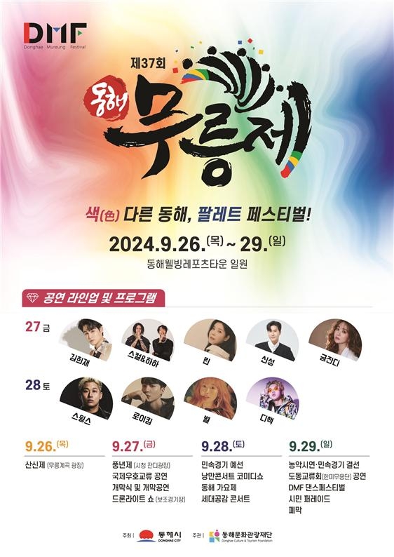 21일 시에 따르면 이번 동해무릉제는 ''색' 다른 동해, 팔레트 페스티벌!'을 부제로 공연 관람형 콘텐츠에 체험형 프로그램을 접목해 관광과 지역 경제 활성화를 도모하는데 주안점을 뒀다.