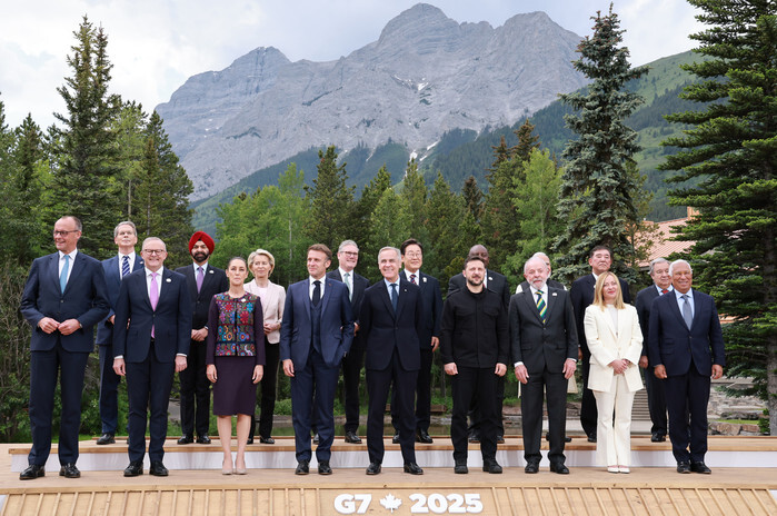 South Korean President Lee Jae Myung (5th from L, 2nd row) poses for a group photo with the Group of Seven leaders and invited world leaders at the Group of Seven summit venue in Kananaskis, Canada, on June 17, 2025. (Yonhap)