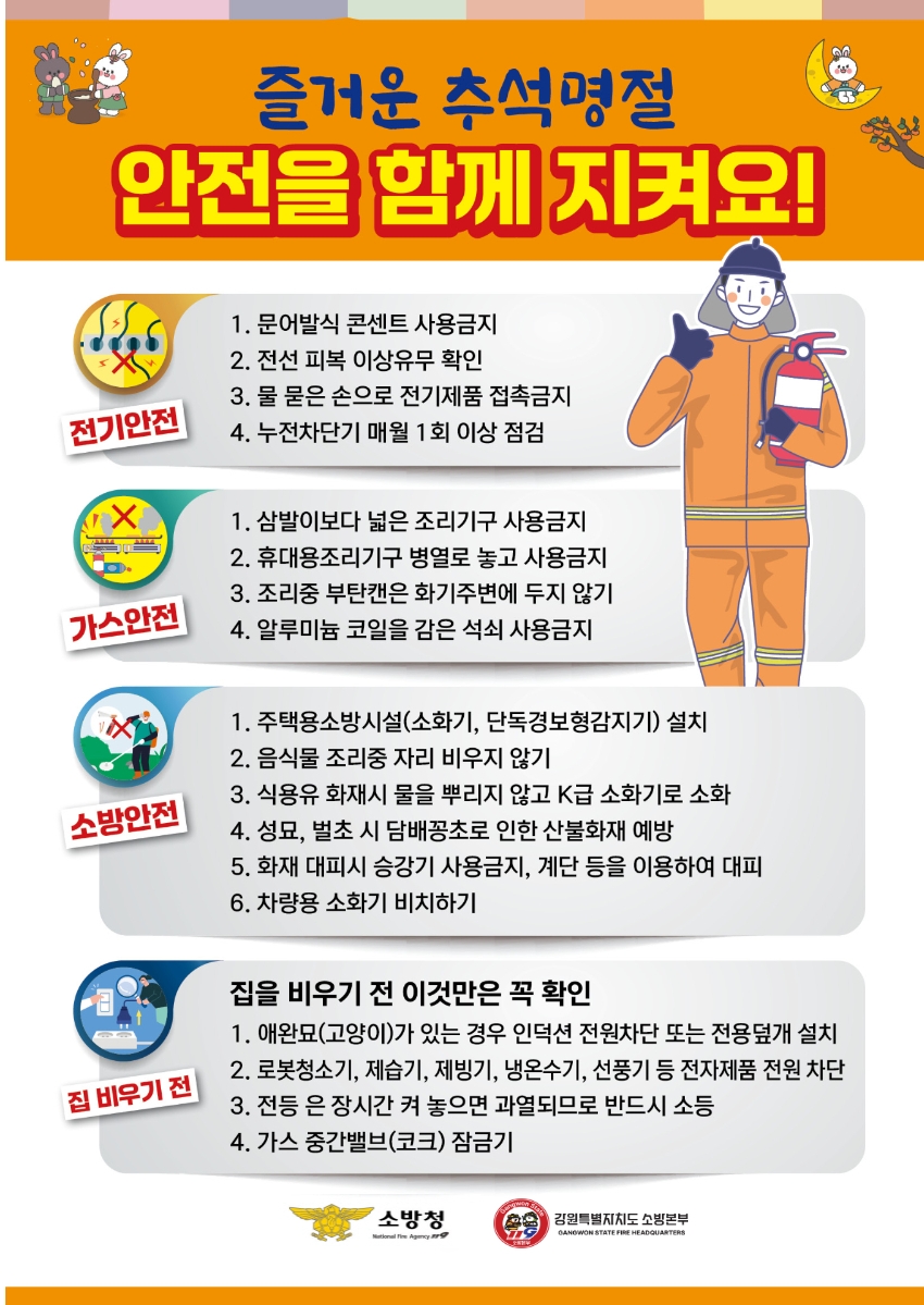 강원소방은 추석 명절을 맞아 화재 예방 중요성을 알리기 위해 공중파 방송, 라디오, 사회관계망서비스(SNS)를 활용해 화재 예방 수칙, 대피요령을 홍보한다.
