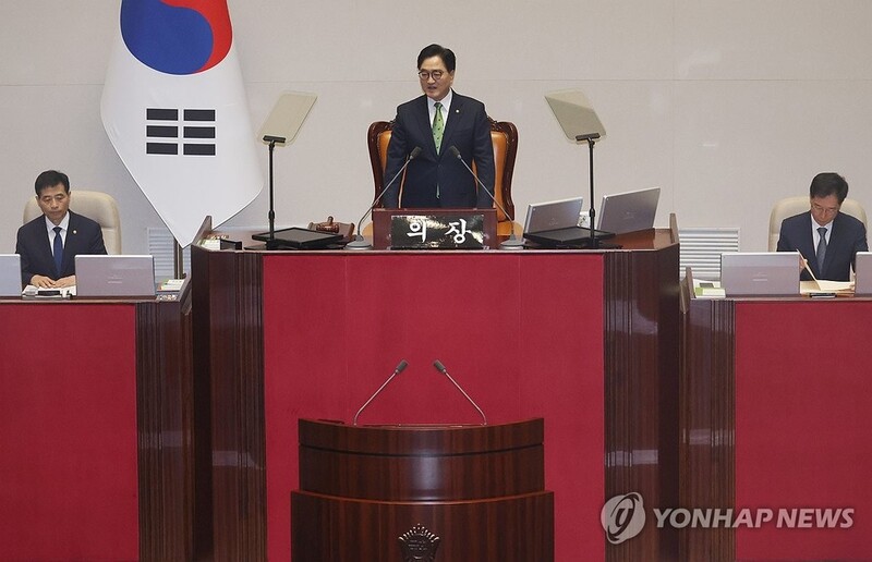 | ▲ National Assembly Speaker Woo Won-shik (C) presides over the opening ceremony for the 22nd National Assembly at the parliament's plenary chamber in Seoul on Sept. 2, 2024. (Yonhap) |