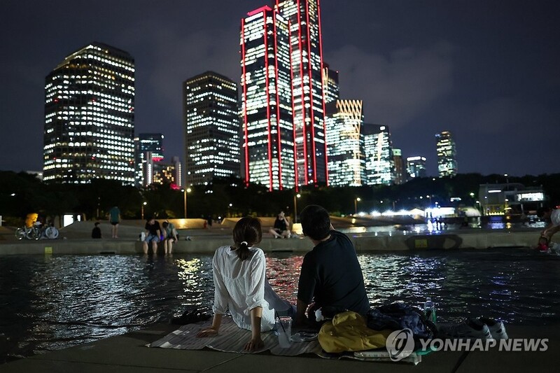 | ▲ People cool off at Mulbit Square along the Han River on Aug. 20, 2024, during the 30th consecutive tropical night, setting a new record in the capital. (Yonhap) |