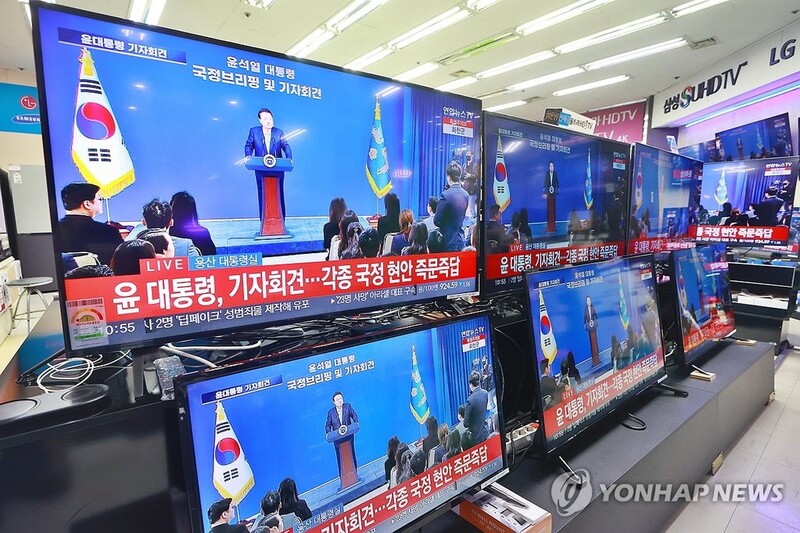 | ▲ Televisions displayed at an electronic store in Seoul show President Yoon Suk Yeol's press conference on Aug. 29, 2024. (Yonhap) |