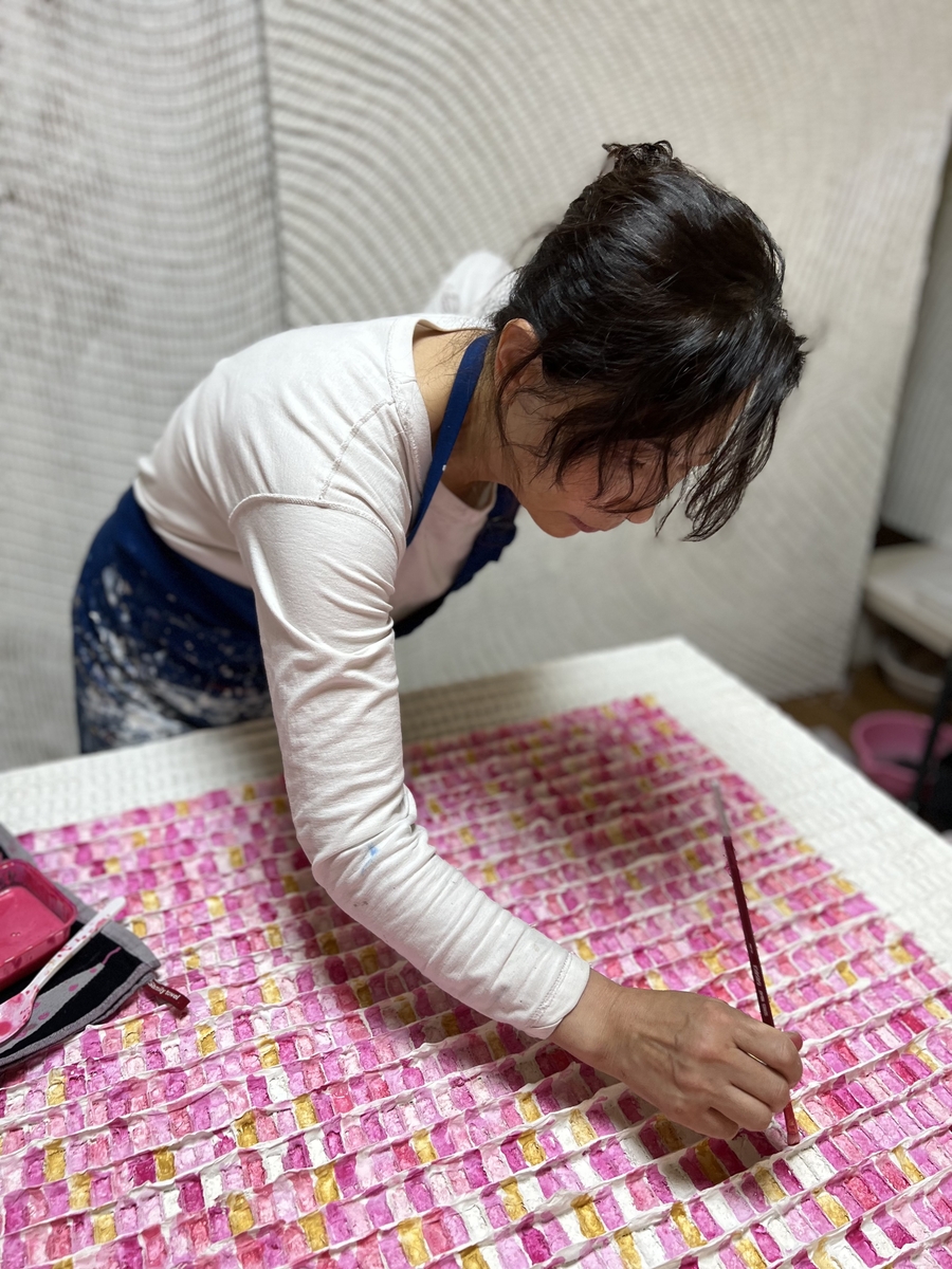 이 같은 방식은 지난 2018년 11월 초대전 참가 차 잠시 머물렀던 전남 구례 화엄사에서 한 동자승의 싸리 빗자루 자국을 보고 영감을 얻었다.