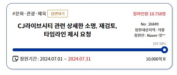 김 지사는 도민 1만758명이 참여한 'CJ라이브시티 관련 상세한 소명, 재검토, 타임라인 제시 요청' 제목의 도민 청원에 대해 이같이 답변내용을 도민청원 홈페이지에 게시했다.