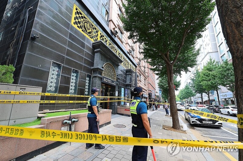 | ▲ A police line is installed at the site of a hotel fire that killed seven people and injured a dozen others in Bucheon, just west of Seoul, on Aug. 25, 2024. (Yonhap) |