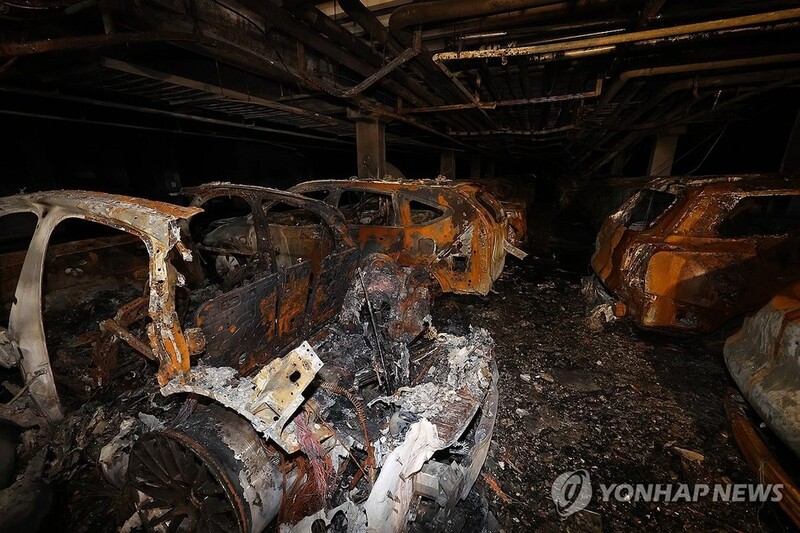 | ▲ This Aug. 2, 2024, file photo shows a parking garage along with vehicles damaged by an apartment complex fire that began from a Mercedes-Benz electric vehicle in Incheon, west of Seoul. (Yonhap) |