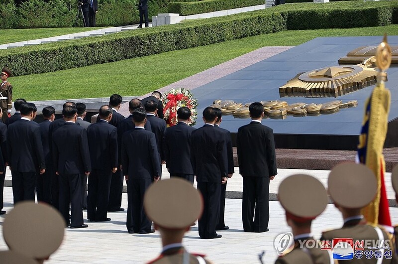 | ▲ This photo, carried by North Korea's official Korean Central News Agency on Aug. 16, 2024, shows the North's leader Kim Jong-un visiting the Liberation Tower in Pyongyang to pay tribute to fallen soldiers of the former Soviet Union the previous day to mark the 79th anniversary of Korea's liberation from Japan's 1910-45 colonial rule. (For Use Only in the Republic of Korea. No Redistribution) (Yonhap) |