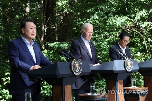 | ▲ This file photo, taken Aug. 20, 2023, shows South Koraen President Yoon Suk Yeol (L), U.S. President Joe Biden (C) and Japanese Prime Minister Fumio Kishida holding a joint press conference at the Camp David presidential retreat in Maryland. (Yonhap) |