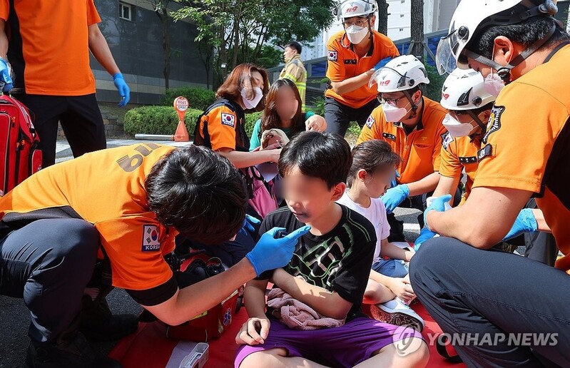 | ▲ Firefighters attend to children who escaped from an apartment complex in Incheon, west of Seoul, on Aug. 1, 2024, when a parking garage was engulfed in flames after an electric vehicle spontaneously exploded. (Yonhap) |