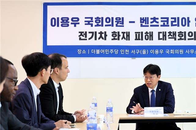 | ▲ This photo provided by the office of Democratic Party Rep. Lee Yong-woo (R) shows the lawmaker speaking to senior officials of Mercedes-Benz Korea at his office in Incheon, west of Seoul, on Aug. 7, 2024, over a recent apartment parking garage fire that started in a Mercedes-Benz electric vehicle the previous week. (PHOTO NOT FOR SALE) (Yonhap) |
