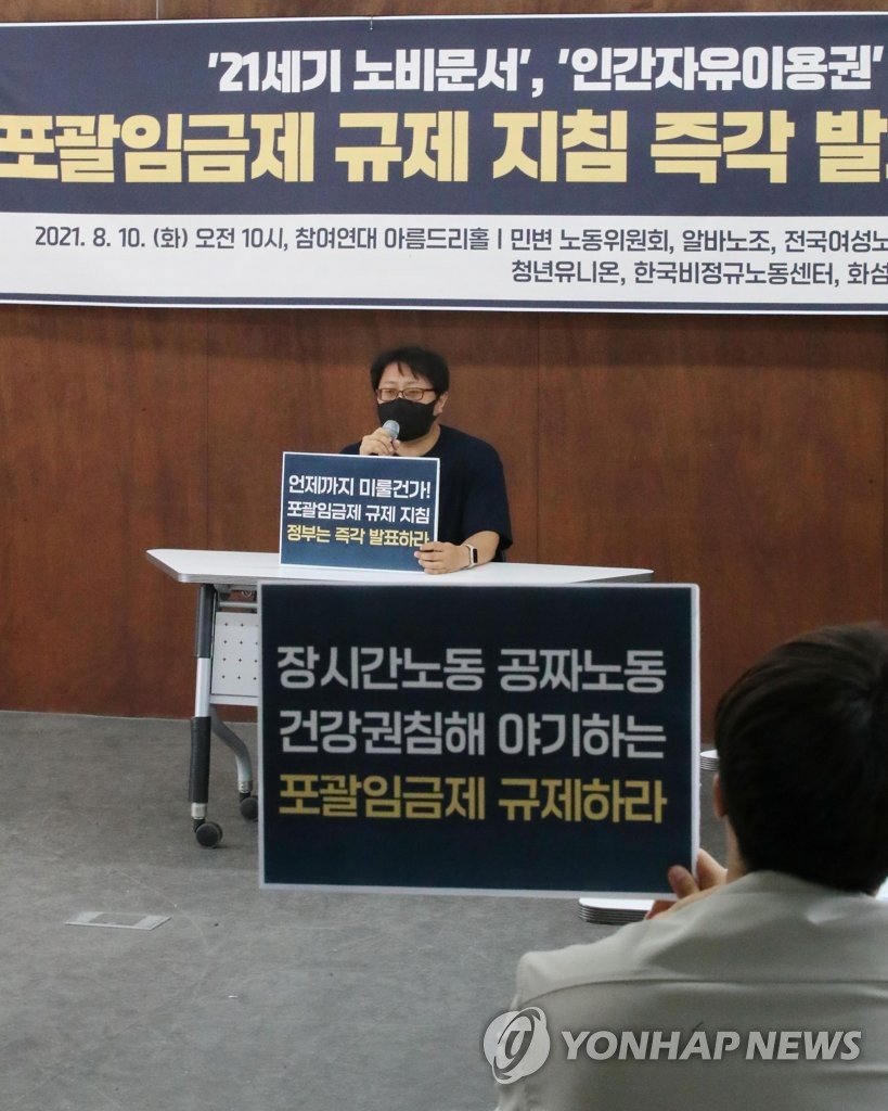 | ▲ '포괄임금제 규제 지침 즉각 발표하라' (서울=연합뉴스) 이재희 기자 = 10일 오전 서울 종로구 참여연대에서 열린 '포괄임금제 규제 지침 발표 촉구하는 노동시민사회단체 기자회견'에서 서승욱 카카오지회장이 발언하고 있다. 2021.8.10 scape@yna.co.kr |