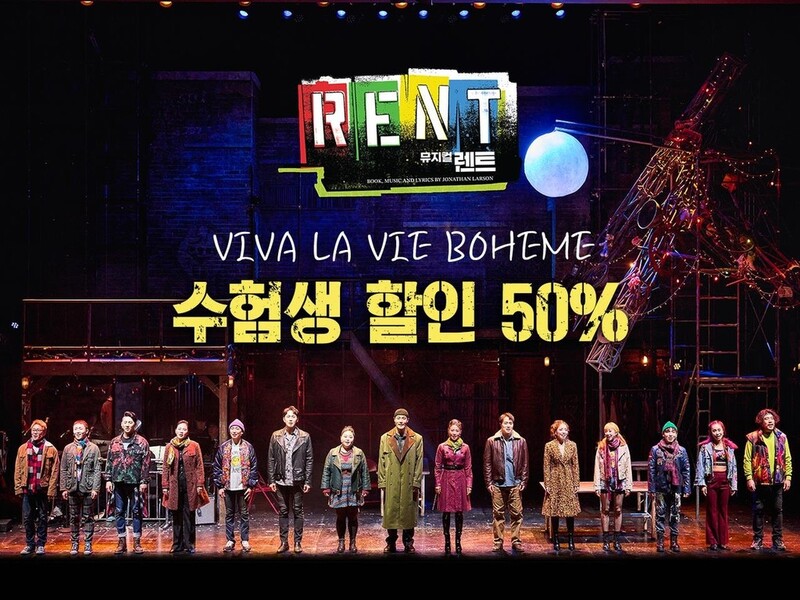 공연 기획사 신시컴퍼니는 다음 달 14일까지 뮤지컬 '렌트' 티켓을 수험생에게 화·수·목요일 공연을 50% 할인된 금액으로 예매할 수 있게 해준다. 할인 혜택은 수험생 본인만 적용된다.