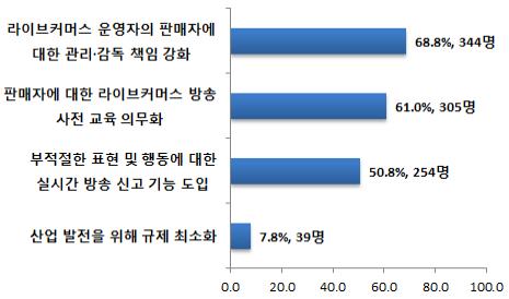 뒤이어 '판매자에 대한 라이브커머스 방송 사전 교육 의무화'(61%), '부적절한 표현 및 행동에 대한 실시간 시청자 신고 기능 도입'(50.8%) 등의 순이었다.