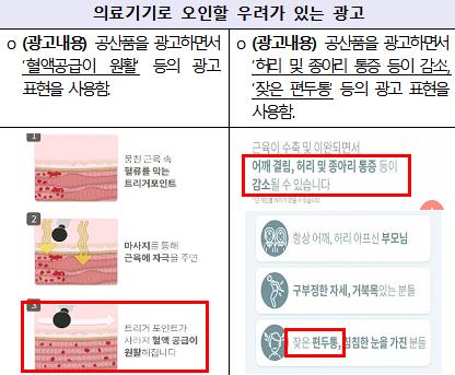 10개 앱 가운데 3개는 일반 식품을 면역력 등에 효과가 있는 건강기능식품으로 오인할 우려가 있는 광고를, 1개는 일반 마사지기를 혈액 공급과 통증 감소에 도움을 주는 의료기기처럼 표현한 광고를 했다.