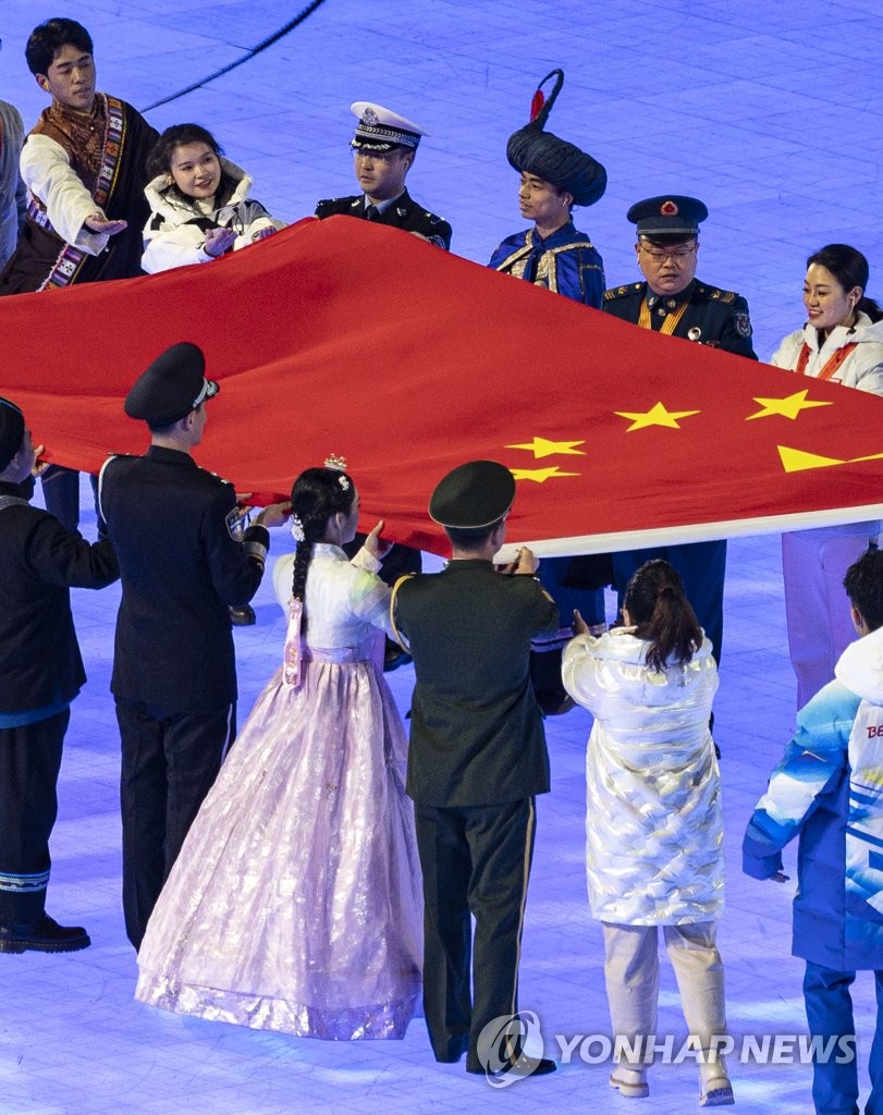 | ▲ [올림픽] '치마 저고리에 댕기머리', 올림픽 개회식에 등장한 한복 (베이징=연합뉴스) 황광모 기자 = 4일 오후 중국 베이징 국립경기장에서 열린 2022 베이징 동계올림픽 개회식에서 치마 저고리와 댕기 머리를 등 한복 복장을 한 공연자가 개최국 국기 게양을 위해 중국의 오성홍기를 옮기고 있다. 2022.2.5 hkmpooh@yna.co.kr |