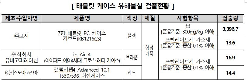 이번 조사에서는 합성수지제품 안전기준을 준용해 안전성을 시험한 결과 태블릿PC 케이스 3개 제품에서 준용 기준인 0.1% 이하를 최대 169배 초과하는 프탈레이트계 가소제가 검출됐다.