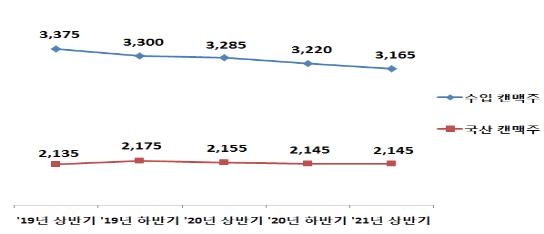 반면 국산 캔맥주의 평균 가격은 같은 기간 2천135원에서 2천145원으로 0.5% 상승했다.