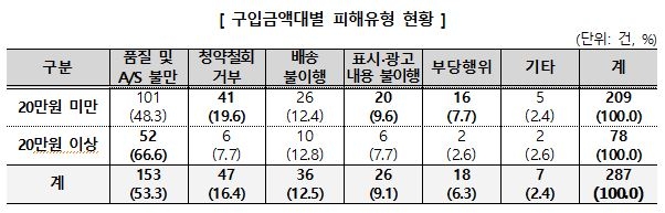 20만원 미만 제품 관련 피해의 경우 청약철회 거부(19.6%)와 표시·광고 내용 불이행(9.6%) 유형의 비중이, 20만원 이상 제품은 품질 및 AS 불만(66.6%) 관련 내용의 비중이 상대적으로 컸다.