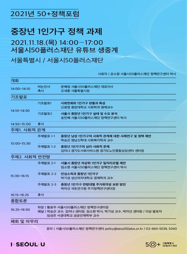 기조 발표를 통해 사회적 변화에 따른 1인 가구의 현황과 특성, 서울시 중장년 1인 가구의 실태를 살펴보고, 각 분야 전문가들이 '사회적 관계' 및 '사회적 안전망'을 주제로 사례 연구를 발표하고 정책을 제안한다.