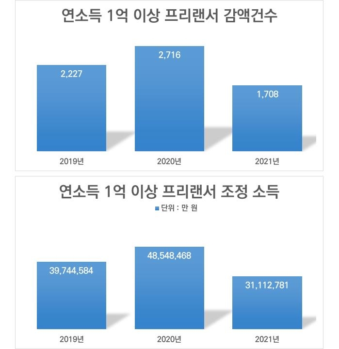이들이 조정 신청해 조정받은 소득금액도 2019년 3천974억4천584만원, 2020년 4천854억8천468만원, 2021년 3천111억2천781만원 등으로 매년 3천억원을 훌쩍 넘었다.
