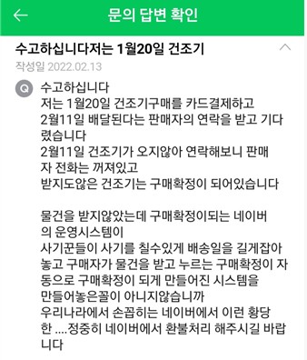 그러나 3주를 넘기고도 건조기가 배송되지 않았지만, 그새 자동 구매 확정이 돼 결제액이 판매자에게 입금됐고 주문을 취소할 수도 없었다.