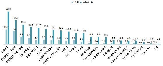 '코로나19가 경제에 미치는 영향' 92.4점, '소상공인 문제' 87.3점, '주식시장' 86.8점, '청년실업 및 고용' 85.1점, '가계소득' 83.6점, '소비심리 및 내수경기' 83.5점 등이었다.